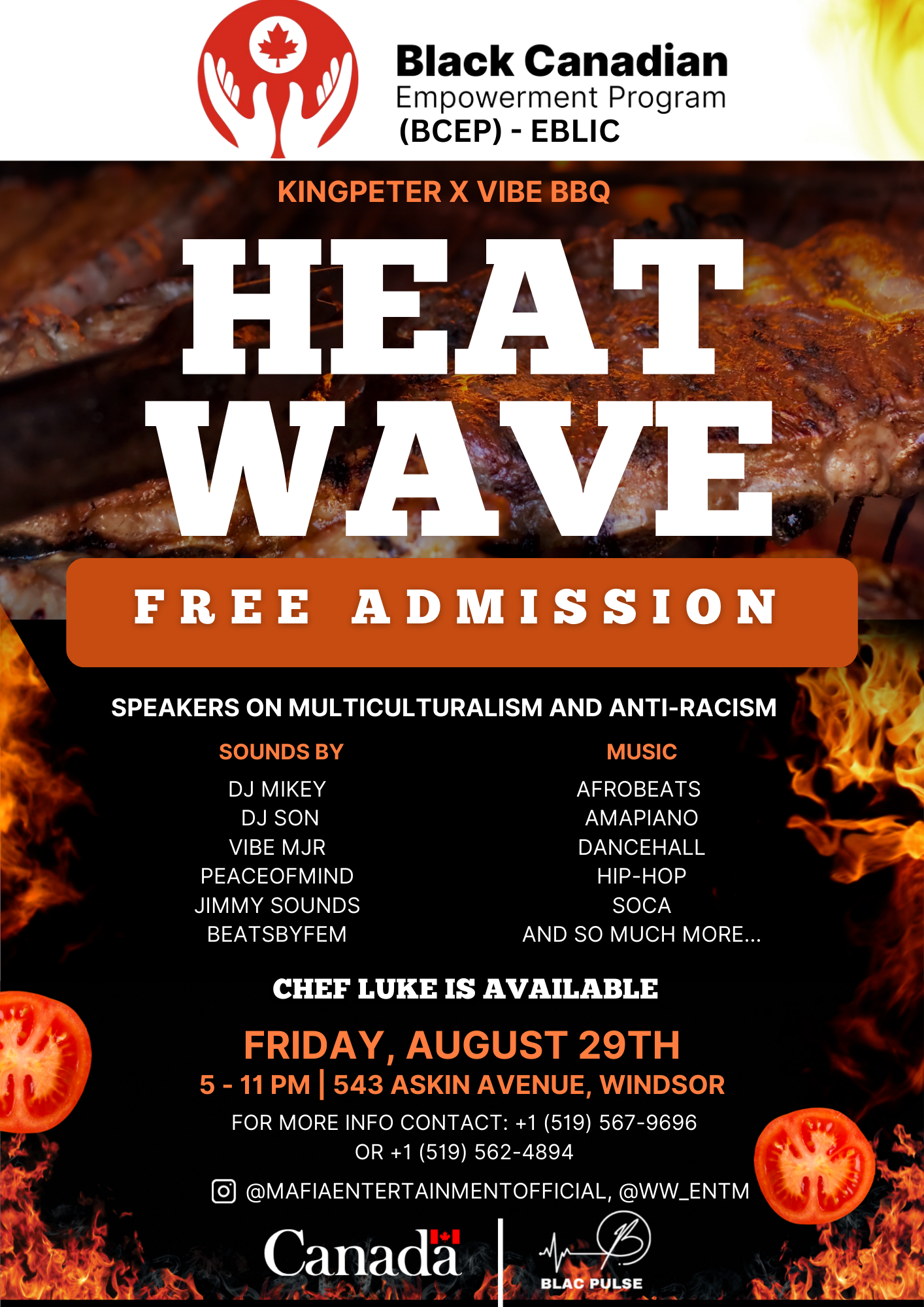 Black Canadian Empowerment Program proudly presents HeatWave Location: 543 Askin Avenue, Windsor Highlights Partners & Sponsors: Don't miss out! For more information, contact us at +1 (519) 567-9696 or +1 (519) 562-4894 Send a DM on IG: @MAFIAENTERTAINMENTOFFICIAL, @WW_ENTM See you there!